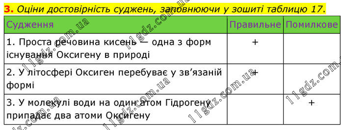 3. Оціни достовірність суджень, заповнюючи у зошиті таблицю 17. Судження Правильне Помилкове 1. Проста речовина кисень — одна з форм існування Оксигену в природі + 2. У літосфері Оксиген перебуває у зв’язаній формі + 3. У молекулі води на один атом Гідрогену припадає два атоми Оксигену +