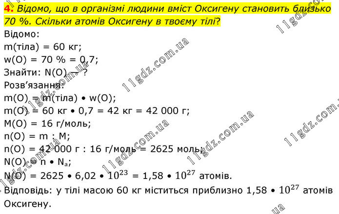 4. Відомо, що в організмі людини вміст Оксигену становить близько 70 %. Скільки атомів Оксигену в твоєму тілі? Відомо: m(тіла) = 60 кг; w(O) = 70 % = 0,7; Знайти: N(O) — ? Розв’язання: m(O) = m(тіла) • w(O); m(O) = 60 кг • 0,7 = 42 кг = 42 000 г; M(O) = 16 г/моль; n(O) = m : M; n(O) = 42 000 г : 16 г/моль = 2625 моль; N(O) = n • Nₐ; N(O) = 2625 • 6,02 • 10^23 = 1,58 • 10^27 атомів. Відповідь: у тілі масою 60 кг міститься приблизно 1,58 • 10^27 атомів Оксигену.