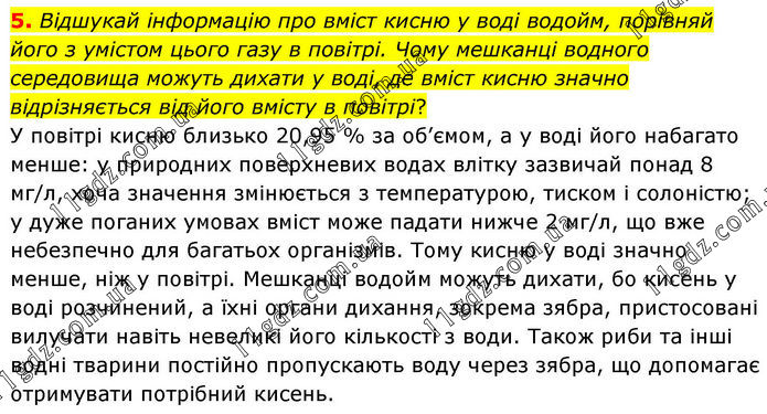 5. Відшукай інформацію про вміст кисню у воді водойм, порівняй його з умістом цього газу в повітрі. Чому мешканці водного середовища можуть дихати у воді, де вміст кисню значно відрізняється від його вмісту в повітрі? У повітрі кисню близько 20,95 % за об’ємом, а у воді його набагато менше: у природних поверхневих водах влітку зазвичай понад 8 мг/л, хоча значення змінюється з температурою, тиском і солоністю; у дуже поганих умовах вміст може падати нижче 2 мг/л, що вже небезпечно для багатьох організмів. Тому кисню у воді значно менше, ніж у повітрі. Мешканці водойм можуть дихати, бо кисень у воді розчинений, а їхні органи дихання, зокрема зябра, пристосовані вилучати навіть невеликі його кількості з води. Також риби та інші водні тварини постійно пропускають воду через зябра, що допомагає отримувати потрібний кисень.
