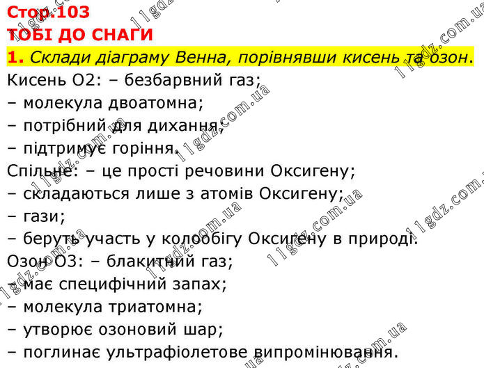 ТОБІ ДО СНАГИ 1. Склади діаграму Венна, порівнявши кисень та озон. Кисень O2: – безбарвний газ; – молекула двоатомна; – потрібний для дихання; – підтримує горіння. Спільне: – це прості речовини Оксигену; – складаються лише з атомів Оксигену; – гази; – беруть участь у колообігу Оксигену в природі. Озон O3: – блакитний газ; – має специфічний запах; – молекула триатомна; – утворює озоновий шар; – поглинає ультрафіолетове випромінювання.