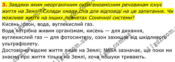 3. Завдяки яким неорганічним оксигеновмісним речовинам існує життя на Землі? Склади хмару слів для відповіді на це запитання. Чи можливе життя на інших планетах Сонячної системи? Кисень, озон, вода, вуглекислий газ. Вода потрібна живим організмам, кисень — для дихання, вуглекислий газ — для фотосинтезу, озон захищає від шкідливого ультрафіолету. Достовірно відоме життя лише на Землі; NASA зазначає, що поки ми знаємо про життя тільки на Землі, хоча пошуки тривають.