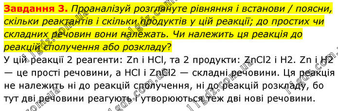 Завдання 3. Проаналізуй розглянуте рівняння і встанови / поясни, скільки реактантів і скільки продуктів у цій реакції; до простих чи складних речовин вони належать. Чи належить ця реакція до реакцій сполучення або розкладу? У цій реакції 2 реагенти: Zn і HCl, та 2 продукти: ZnCl2 і H2. Zn і H2 — це прості речовини, а HCl і ZnCl2 — складні речовини. Ця реакція не належить ні до реакцій сполучення, ні до реакцій розкладу, бо тут дві речовини реагують і утворюються теж дві нові речовини.