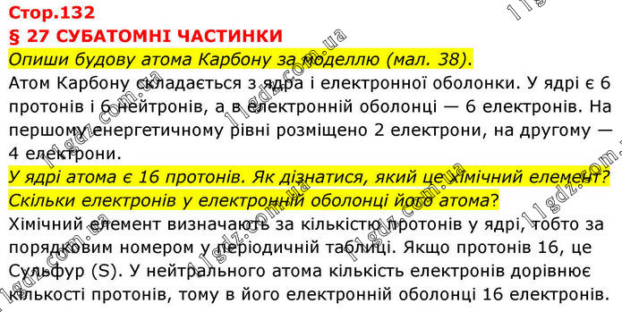 § 27 СУБАТОМНІ ЧАСТИНКИ Опиши будову атома Карбону за моделлю (мал. 38). Атом Карбону складається з ядра і електронної оболонки. У ядрі є 6 протонів і 6 нейтронів, а в електронній оболонці — 6 електронів. На першому енергетичному рівні розміщено 2 електрони, на другому — 4 електрони. У ядрі атома є 16 протонів. Як дізнатися, який це хімічний елемент? Скільки електронів у електронній оболонці його атома? Хімічний елемент визначають за кількістю протонів у ядрі, тобто за порядковим номером у періодичній таблиці. Якщо протонів 16, це Сульфур (S). У нейтрального атома кількість електронів дорівнює кількості протонів, тому в його електронній оболонці 16 електронів.