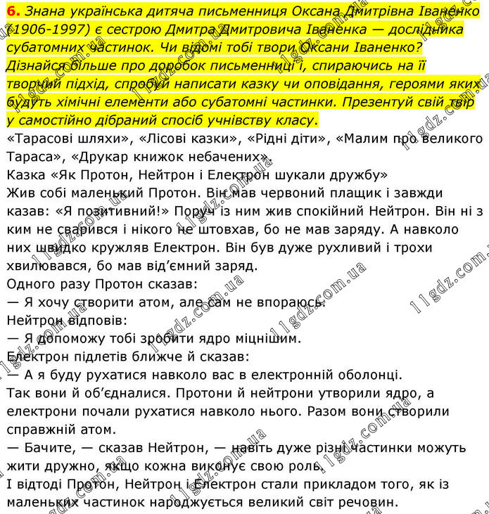 6. Знана українська дитяча письменниця Оксана Дмитрівна Іваненко (1906–1997) є сестрою Дмитра Дмитровича Іваненка — дослідника субатомних частинок. Чи відомі тобі твори Оксани Іваненко? Дізнайся більше про доробок письменниці і, спираючись на її творчий підхід, спробуй написати казку чи оповідання, героями яких будуть хімічні елементи або субатомні частинки. Презентуй свій твір у самостійно дібраний спосіб учнівству класу. «Тарасові шляхи», «Лісові казки», «Рідні діти», «Малим про великого Тараса», «Друкар книжок небачених». Казка «Як Протон, Нейтрон і Електрон шукали дружбу» Жив собі маленький Протон. Він мав червоний плащик і завжди казав: «Я позитивний!» Поруч із ним жив спокійний Нейтрон. Він ні з ким не сварився і нікого не штовхав, бо не мав заряду. А навколо них швидко кружляв Електрон. Він був дуже рухливий і трохи хвилювався, бо мав від’ємний заряд. Одного разу Протон сказав: — Я хочу створити атом, але сам не впораюсь. Нейтрон відповів: — Я допоможу тобі зробити ядро міцнішим. Електрон підлетів ближче й сказав: — А я буду рухатися навколо вас в електронній оболонці. Так вони й об’єдналися. Протони й нейтрони утворили ядро, а електрони почали рухатися навколо нього. Разом вони створили справжній атом. — Бачите, — сказав Нейтрон, — навіть дуже різні частинки можуть жити дружно, якщо кожна виконує свою роль. І відтоді Протон, Нейтрон і Електрон стали прикладом того, як із маленьких частинок народжується великий світ речовин.