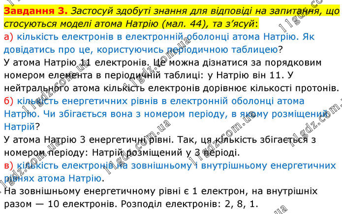 Завдання 3. Застосуй здобуті знання для відповіді на запитання, що стосуються моделі атома Натрію (мал. 44), та з’ясуй: а) кількість електронів в електронній оболонці атома Натрію. Як довідатись про це, користуючись періодичною таблицею? У атома Натрію 11 електронів. Це можна дізнатися за порядковим номером елемента в періодичній таблиці: у Натрію він 11. У нейтрального атома кількість електронів дорівнює кількості протонів. б) кількість енергетичних рівнів в електронній оболонці атома Натрію. Чи збігається вона з номером періоду, в якому розміщений Натрій? У атома Натрію 3 енергетичні рівні. Так, ця кількість збігається з номером періоду: Натрій розміщений у 3 періоді. в) кількість електронів на зовнішньому і внутрішньому енергетичних рівнях атома Натрію. На зовнішньому енергетичному рівні є 1 електрон, на внутрішніх разом — 10 електронів. Розподіл електронів: 2, 8, 1.