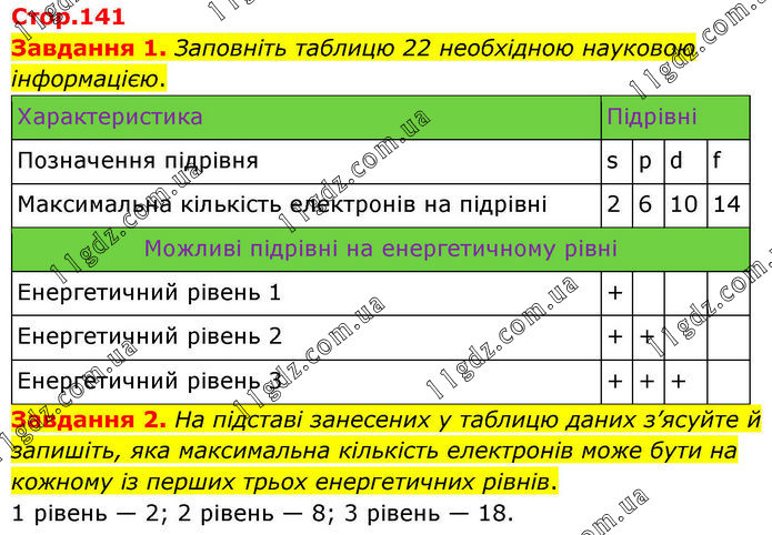 Завдання 1. Заповніть таблицю 22 необхідною науковою інформацією. Завдання 2. На підставі занесених у таблицю даних з’ясуйте й запишіть, яка максимальна кількість електронів може бути на кожному із перших трьох енергетичних рівнів. 1 рівень — 2; 2 рівень — 8; 3 рівень — 18.