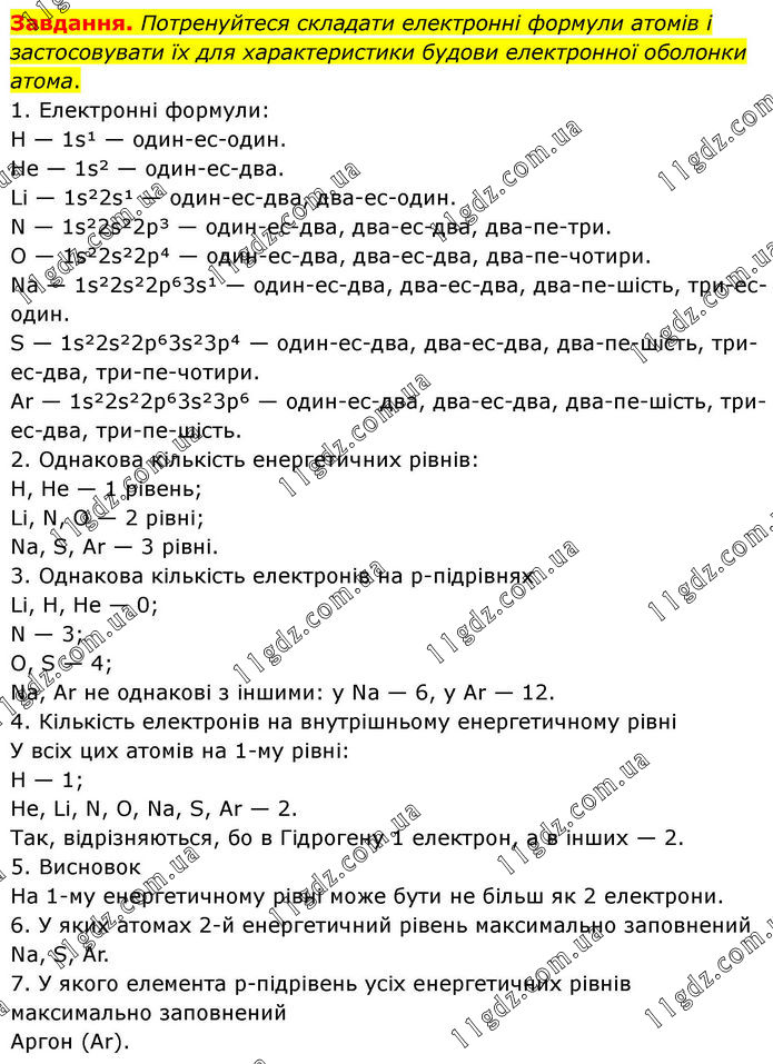 Завдання. Потренуйтеся складати електронні формули атомів і застосовувати їх для характеристики будови електронної оболонки атома. 1. Електронні формули: H — 1s¹ — один–ес–один. He — 1s² — один–ес–два. Li — 1s²2s¹ — один–ес–два, два–ес–один. N — 1s²2s²2p³ — один–ес–два, два–ес–два, два–пе–три. O — 1s²2s²2p⁴ — один–ес–два, два–ес–два, два–пе–чотири. Na — 1s²2s²2p⁶3s¹ — один–ес–два, два–ес–два, два–пе–шість, три–ес–один. S — 1s²2s²2p⁶3s²3p⁴ — один–ес–два, два–ес–два, два–пе–шість, три–ес–два, три–пе–чотири. Ar — 1s²2s²2p⁶3s²3p⁶ — один–ес–два, два–ес–два, два–пе–шість, три–ес–два, три–пе–шість. 2. Однакова кількість енергетичних рівнів: H, He — 1 рівень; Li, N, O — 2 рівні; Na, S, Ar — 3 рівні. 3. Однакова кількість електронів на p–підрівнях Li, H, He — 0; N — 3; O, S — 4; Na, Ar не однакові з іншими: у Na — 6, у Ar — 12. 4. Кількість електронів на внутрішньому енергетичному рівні У всіх цих атомів на 1–му рівні: H — 1; He, Li, N, O, Na, S, Ar — 2. Так, відрізняються, бо в Гідрогену 1 електрон, а в інших — 2. 5. Висновок На 1–му енергетичному рівні може бути не більш як 2 електрони. 6. У яких атомах 2–й енергетичний рівень максимально заповнений Na, S, Ar. 7. У якого елемента p–підрівень усіх енергетичних рівнів максимально заповнений Аргон (Ar).