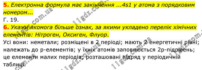 5. Електронна формула має закінчення ...4s1 у атома з порядковим номером... Г. 19. 6. Укажи якомога більше ознак, за якими укладено перелік хімічних елементів: Нітроген, Оксиген, Флуор. Усі вони: неметали; розміщені в 2 періоді; мають 2 енергетичні рівні; належать до p–елементів; у їхніх атомів заповнюється 2p–підрівень; це елементи малих періодів; розташовані підряд у періодичній таблиці.