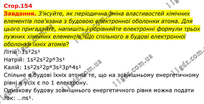 Завдання. З’ясуйте, як періодична зміна властивостей хімічних елементів пов’язана з будовою електронної оболонки атома. Для цього пригадайте, напишіть і порівняйте електронні формули трьох лужних хімічних елементів. Що спільного в будові електронної оболонки їхніх атомів? Літій: 1s²2s¹ Натрій: 1s²2s²2p⁶3s¹ Калій: 1s²2s²2p⁶3s²3p⁶4s¹ Спільне в будові їхніх атомів те, що на зовнішньому енергетичному рівні в усіх є по 1 електрону. Однакову будову зовнішнього енергетичного рівня можна подати так: …ns¹.