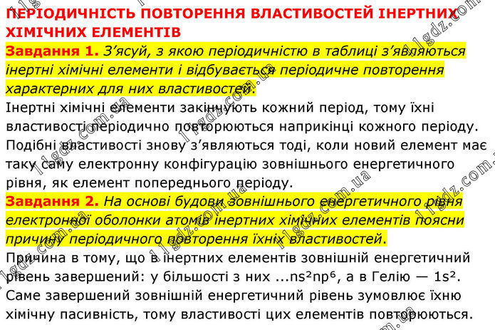 ПЕРІОДИЧНІСТЬ ПОВТОРЕННЯ ВЛАСТИВОСТЕЙ ІНЕРТНИХ ХІМІЧНИХ ЕЛЕМЕНТІВ Завдання 1. З’ясуй, з якою періодичністю в таблиці з’являються інертні хімічні елементи і відбувається періодичне повторення характерних для них властивостей. Інертні хімічні елементи закінчують кожний період, тому їхні властивості періодично повторюються наприкінці кожного періоду. Подібні властивості знову з’являються тоді, коли новий елемент має таку саму електронну конфігурацію зовнішнього енергетичного рівня, як елемент попереднього періоду. Завдання 2. На основі будови зовнішнього енергетичного рівня електронної оболонки атомів інертних хімічних елементів поясни причину періодичного повторення їхніх властивостей. Причина в тому, що в інертних елементів зовнішній енергетичний рівень завершений: у більшості з них ...ns²np⁶, а в Гелію — 1s². Саме завершений зовнішній енергетичний рівень зумовлює їхню хімічну пасивність, тому властивості цих елементів повторюються.