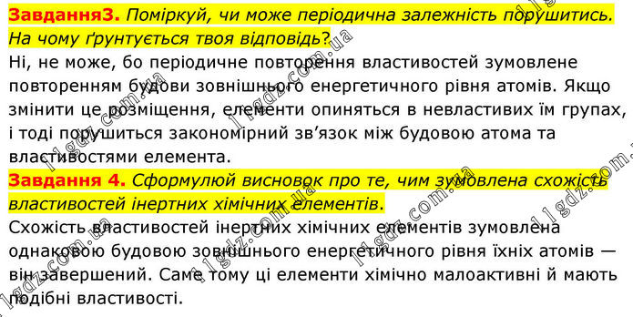 Завдання 3. Поміркуй, чи може періодична залежність порушитись. На чому ґрунтується твоя відповідь? Ні, не може, бо періодичне повторення властивостей зумовлене повторенням будови зовнішнього енергетичного рівня атомів. Якщо змінити це розміщення, елементи опиняться в невластивих їм групах, і тоді порушиться закономірний зв’язок між будовою атома та властивостями елемента. Завдання 4. Сформулюй висновок про те, чим зумовлена схожість властивостей інертних хімічних елементів. Схожість властивостей інертних хімічних елементів зумовлена однаковою будовою зовнішнього енергетичного рівня їхніх атомів — він завершений. Саме тому ці елементи хімічно малоактивні й мають подібні властивості.