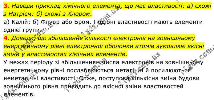 3. Наведи приклад хімічного елемента, що має властивості: а) схожі з Натрієм; б) схожі з Хлором. а) Калій; б) Флуор або Бром. Подібні властивості мають елементи однієї групи. 4. Доведи, що збільшення кількості електронів на зовнішньому енергетичному рівні електронної оболонки атомів зумовлює якісні зміни у властивостях хімічних елементів. У межах періоду зі збільшенням числа електронів на зовнішньому енергетичному рівні послаблюються металічні й посилюються неметалічні властивості. Отже, поступова кількісна зміна будови зовнішнього рівня приводить до якісної зміни властивостей елементів.