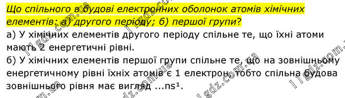 Що спільного в будові електронних оболонок атомів хімічних елементів: а) другого періоду; б) першої групи? а) У хімічних елементів другого періоду спільне те, що їхні атоми мають 2 енергетичні рівні. б) У хімічних елементів першої групи спільне те, що на зовнішньому енергетичному рівні їхніх атомів є 1 електрон, тобто спільна будова зовнішнього рівня має вигляд ...ns¹.