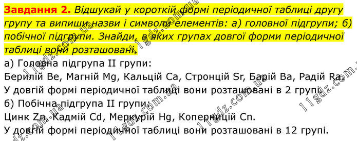 Завдання 2. Відшукай у короткій формі періодичної таблиці другу групу та випиши назви і символи елементів: а) головної підгрупи; б) побічної підгрупи. Знайди, в яких групах довгої форми періодичної таблиці вони розташовані. а) Головна підгрупа ІІ групи: Берилій Be, Магній Mg, Кальцій Ca, Стронцій Sr, Барій Ba, Радій Ra. У довгій формі періодичної таблиці вони розташовані в 2 групі. б) Побічна підгрупа ІІ групи: Цинк Zn, Кадмій Cd, Меркурій Hg, Коперницій Cn. У довгій формі періодичної таблиці вони розташовані в 12 групі.