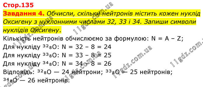 Завдання 4. Обчисли, скільки нейтронів містить кожен нуклід Оксигену з нуклонними числами 32, 33 і 34. Запиши символи нуклідів Оксигену. Кількість нейтронів обчислюємо за формулою: N = A – Z; Для нукліду ³²₈O: N = 32 – 8 = 24 Для нукліду ³³₈O: N = 33 – 8 = 25 Для нукліду ³⁴₈O: N = 34 – 8 = 26 Відповідь: ³²₈O — 24 нейтрони; ³³₈O — 25 нейтронів; ³⁴₈O — 26 нейтронів.