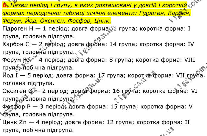 6. Назви період і групу, в яких розташовані у довгій і короткій формах періодичної таблиці хімічні елементи: Гідроген, Карбон, Ферум, Йод, Оксиген, Фосфор, Цинк. Гідроген H — 1 період; довга форма: 1 група; коротка форма: I група, головна підгрупа. Карбон C — 2 період; довга форма: 14 група; коротка форма: IV група, головна підгрупа. Ферум Fe — 4 період; довга форма: 8 група; коротка форма: VIII група, побічна підгрупа. Йод I — 5 період; довга форма: 17 група; коротка форма: VII група, головна підгрупа. Оксиген O — 2 період; довга форма: 16 група; коротка форма: VI група, головна підгрупа. Фосфор P — 3 період; довга форма: 15 група; коротка форма: V група, головна підгрупа. Цинк Zn — 4 період; довга форма: 12 група; коротка форма: II група, побічна підгрупа.