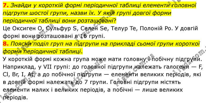 7. Знайди у короткій формі періодичної таблиці елементи головної підгрупи шостої групи, назви їх. У якій групі довгої форми періодичної таблиці вони розташовані? Це Оксиген O, Сульфур S, Селен Se, Телур Te, Полоній Po. У довгій формі вони розташовані в 16 групі. 8. Поясни поділ груп на підгрупи на прикладі сьомої групи короткої форми періодичної таблиці. У короткій формі кожна група може мати головну і побічну підгрупи. Наприклад, у VII групі: до головної підгрупи належать галогени — F, Cl, Br, I, At, а до побічної підгрупи — елементи великих періодів, які в довгій формі належать до 7 групи. Головні підгрупи містять елементи малих і великих періодів, а побічні — лише великих періодів.