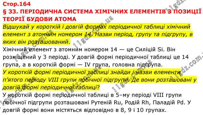 § 33. ПЕРІОДИЧНА СИСТЕМА ХІМІЧНИХ ЕЛЕМЕНТІВ З ПОЗИЦІЇ ТЕОРІЇ БУДОВИ АТОМА Відшукай у короткій і довгій формах періодичної таблиці хімічний елемент з атомним номером 14. Назви період, групу та підгрупу, в яких він розташований. Хімічний елемент з атомним номером 14 — це Силіцій Si. Він розміщений у 3 періоді. У довгій формі періодичної таблиці це 14 група, а в короткій формі — IV група, головна підгрупа. У короткій формі періодичної таблиці знайди і назви елементи п’ятого періоду VIII групи побічної підгрупи. Де вони розташовані у довгій формі періодичної таблиці? У короткій формі періодичної таблиці в 5–му періоді VIII групи побічної підгрупи розташовані Рутеній Ru, Родій Rh, Паладій Pd. У довгій формі вони містяться відповідно в 8, 9 і 10 групах.