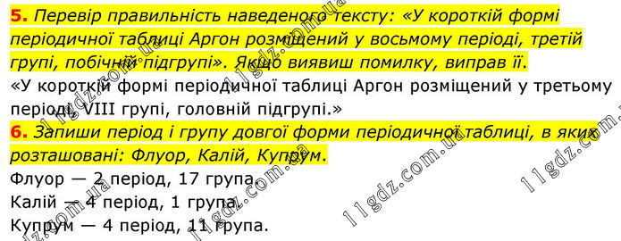 5. Перевір правильність наведеного тексту: «У короткій формі періодичної таблиці Аргон розміщений у восьмому періоді, третій групі, побічній підгрупі». Якщо виявиш помилку, виправ її. «У короткій формі періодичної таблиці Аргон розміщений у третьому періоді, VIII групі, головній підгрупі.» 6. Запиши період і групу довгої форми періодичної таблиці, в яких розташовані: Флуор, Калій, Купрум. Флуор — 2 період, 17 група. Калій — 4 період, 1 група. Купрум — 4 період, 11 група.