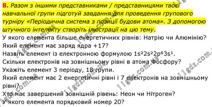 8. Разом з іншими представниками / представницями твоєї навчальної групи підготуй завдання для проведення групового турніру «Періодична система з позиції будови атома». З допомогою штучного інтелекту створіть ілюстрації на цю тему. У якого елемента більше енергетичних рівнів: Натрію чи Алюмінію? Який елемент має заряд ядра +17? Назвіть елемент із електронною формулою 1s²2s²2p⁶3s¹. Скільки електронів на зовнішньому рівні в атома Фосфору? Укажіть елемент 3 періоду, 18 групи. Який елемент має 2 енергетичні рівні і 7 електронів на зовнішньому рівні? Хто має завершений зовнішній рівень: Неон чи Нітроген? У якого елемента порядковий номер 20?