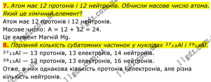 7. Атом має 12 протонів і 12 нейтронів. Обчисли масове число атома. Який це хімічний елемент? Атом має 12 протонів і 12 нейтронів. Масове число: A = 12 + 12 = 24. Це елемент Магній Mg. 8. Порівняй кількість субатомних частинок у нуклідах ²⁷₁₃Al і ²⁹₁₃Al. ²⁷₁₃Al — 13 протонів, 13 електронів, 14 нейтронів. ²⁹₁₃Al — 13 протонів, 13 електронів, 16 нейтронів. Отже, в них однакова кількість протонів і електронів, але різна кількість нейтронів.