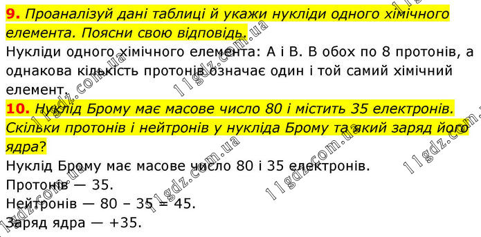 9. Проаналізуй дані таблиці й укажи нукліди одного хімічного елемента. Поясни свою відповідь. Нукліди одного хімічного елемента: А і В. В обох по 8 протонів, а однакова кількість протонів означає один і той самий хімічний елемент. 10. Нуклід Брому має масове число 80 і містить 35 електронів. Скільки протонів і нейтронів у нукліда Брому та який заряд його ядра? Нуклід Брому має масове число 80 і 35 електронів. Протонів — 35. Нейтронів — 80 – 35 = 45. Заряд ядра — +35.
