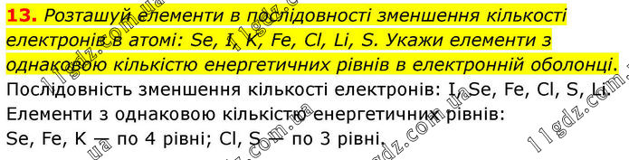 13. Розташуй елементи в послідовності зменшення кількості електронів в атомі: Se, I, K, Fe, Cl, Li, S. Укажи елементи з однаковою кількістю енергетичних рівнів в електронній оболонці. Послідовність зменшення кількості електронів: I, Se, Fe, Cl, S, Li. Елементи з однаковою кількістю енергетичних рівнів: Se, Fe, K — по 4 рівні; Cl, S — по 3 рівні.