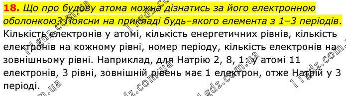 18. Що про будову атома можна дізнатись за його електронною оболонкою? Поясни на прикладі будь–якого елемента з 1–3 періодів. Кількість електронів у атомі, кількість енергетичних рівнів, кількість електронів на кожному рівні, номер періоду, кількість електронів на зовнішньому рівні. Наприклад, для Натрію 2, 8, 1: у атомі 11 електронів, 3 рівні, зовнішній рівень має 1 електрон, отже Натрій у 3 періоді.