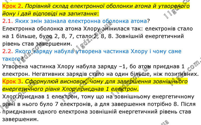 Крок 2. Порівняй склад електронної оболонки атома й утвореного йону і дай відповіді на запитання: 2.1. Яких змін зазнала електронна оболонка атома? Електронна оболонка атома Хлору змінилася так: електронів стало на 1 більше, було 2, 8, 7, стало 2, 8, 8. Зовнішній енергетичний рівень став завершеним. 2.2. Якого заряду набула утворена частинка Хлору і чому саме такого? Утворена частинка Хлору набула заряду –1, бо атом приєднав 1 електрон. Негативних зарядів стало на один більше, ніж позитивних. Крок 3. Сформулюй висновок, чому для завершення зовнішнього енергетичного рівня Хлор приєднав 1 електрон. Хлор приєднав 1 електрон, тому що на зовнішньому енергетичному рівні в нього було 7 електронів, а для завершення потрібно 8. Після приєднання одного електрона зовнішній енергетичний рівень став завершеним.