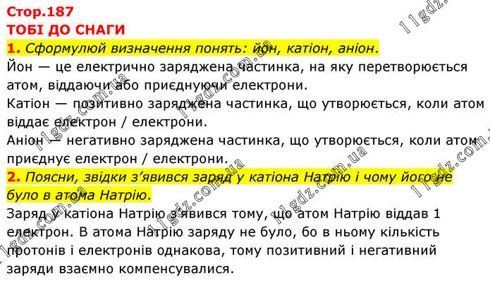 ТОБІ ДО СНАГИ 1. Сформулюй визначення понять: йон, катіон, аніон. Йон — це електрично заряджена частинка, на яку перетворюється атом, віддаючи або приєднуючи електрони. Катіон — позитивно заряджена частинка, що утворюється, коли атом віддає електрон / електрони. Аніон — негативно заряджена частинка, що утворюється, коли атом приєднує електрон / електрони. 2. Поясни, звідки з’явився заряд у катіона Натрію і чому його не було в атома Натрію. Заряд у катіона Натрію з’явився тому, що атом Натрію віддав 1 електрон. В атома Натрію заряду не було, бо в ньому кількість протонів і електронів однакова, тому позитивний і негативний заряди взаємно компенсувалися.