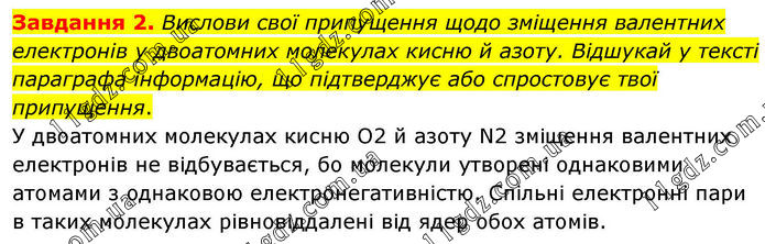 Завдання 2. Вислови свої припущення щодо зміщення валентних електронів у двоатомних молекулах кисню й азоту. Відшукай у тексті параграфа інформацію, що підтверджує або спростовує твої припущення. У двоатомних молекулах кисню O2 й азоту N2 зміщення валентних електронів не відбувається, бо молекули утворені однаковими атомами з однаковою електронегативністю. Спільні електронні пари в таких молекулах рівновіддалені від ядер обох атомів.