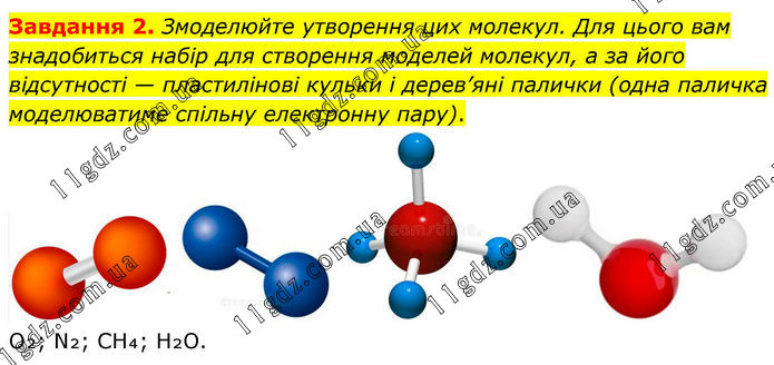 Завдання 2. Змоделюйте утворення цих молекул. Для цього вам знадобиться набір для створення моделей молекул, а за його відсутності — пластилінові кульки і дерев’яні палички (одна паличка моделюватиме спільну електронну пару). O₂; N₂; CH₄; H₂O.
