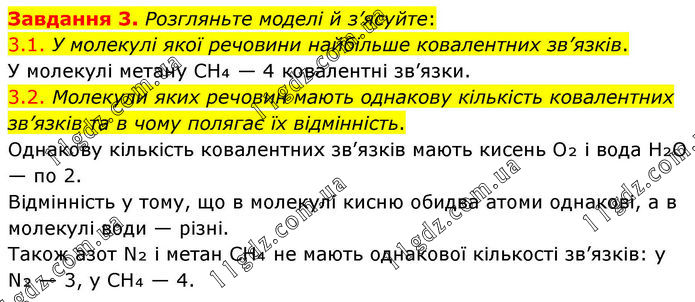 Завдання 3. Розгляньте моделі й з’ясуйте: 3.1. У молекулі якої речовини найбільше ковалентних зв’язків. У молекулі метану CH₄ — 4 ковалентні зв’язки. 3.2. Молекули яких речовин мають однакову кількість ковалентних зв’язків та в чому полягає їх відмінність. Однакову кількість ковалентних зв’язків мають кисень O₂ і вода H₂O — по 2. Відмінність у тому, що в молекулі кисню обидва атоми однакові, а в молекулі води — різні. Також азот N₂ і метан CH₄ не мають однакової кількості зв’язків: у N₂ — 3, у CH₄ — 4.