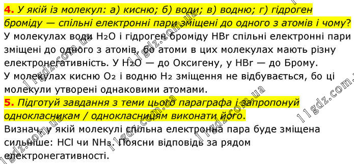 4. У якій із молекул: а) кисню; б) води; в) водню; г) гідроген броміду — спільні електронні пари зміщені до одного з атомів і чому? У молекулах води H₂O і гідроген броміду HBr спільні електронні пари зміщені до одного з атомів, бо атоми в цих молекулах мають різну електронегативність. У H₂O — до Оксигену, у HBr — до Брому. У молекулах кисню O₂ і водню H₂ зміщення не відбувається, бо ці молекули утворені однаковими атомами. 5. Підготуй завдання з теми цього параграфа і запропонуй однокласникам / однокласницям виконати його. Визнач, у якій молекулі спільна електронна пара буде зміщена сильніше: HCl чи NH₃. Поясни відповідь за рядом електронегативності.