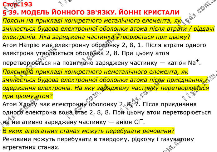 § 39. МОДЕЛЬ ЙОННОГО ЗВ'ЯЗКУ. ЙОННІ КРИСТАЛИ Поясни на прикладі конкретного металічного елемента, як змінюється будова електронної оболонки атома після втрати / віддачі електронів. Яка заряджена частинка утворюється при цьому? Атом Натрію має електронну оболонку 2, 8, 1. Після втрати одного електрона утворюється оболонка 2, 8. При цьому атом перетворюється на позитивно заряджену частинку — катіон Na⁺. Поясни на прикладі конкретного неметалічного елемента, як змінюється будова електронної оболонки атома після приєднання / одержання електронів. На яку заряджену частинку перетворюється при цьому атом? Атом Хлору має електронну оболонку 2, 8, 7. Після приєднання одного електрона вона стає 2, 8, 8. При цьому атом перетворюється на негативно заряджену частинку — аніон Cl⁻. В яких агрегатних станах можуть перебувати речовини? Речовини можуть перебувати в твердому, рідкому і газуватому агрегатних станах.
