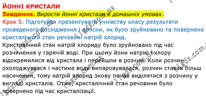 ЙОННІ КРИСТАЛИ Завдання. Вирости йонні кристали в домашніх умовах. Крок 5. Підготуйся презентувати учнівству класу результати проведеного дослідження і поясни, як було зруйновано та повернено кристалічний стан речовині натрій хлорид. Кристалічний стан натрій хлориду було зруйновано під час розчинення у гарячій воді. При цьому йони натрію і хлору відокремилися від кристала і перейшли в розчин. Коли розчин охолоджувався і частина води випаровувалася, розчин ставав більш насиченим, тому натрій хлорид знову почав виділятися з розчину у вигляді кристалів. Отже, кристалічний стан речовини було повернено під час кристалізації.