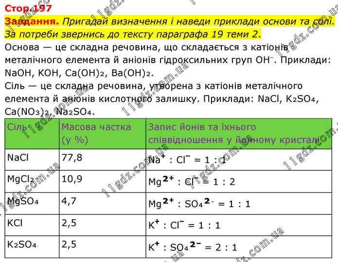 Завдання. Пригадай визначення і наведи приклади основи та солі. За потреби звернись до тексту параграфа 19 теми 2. Основа — це складна речовина, що складається з катіонів металічного елемента й аніонів гідроксильних груп OH⁻. Приклади: NaOH, KOH, Ca(OH)₂, Ba(OH)₂. Сіль — це складна речовина, утворена з катіонів металічного елемента й аніонів кислотного залишку. Приклади: NaCl, K₂SO₄, Ca(NO₃)₂, Na₂SO₄.
