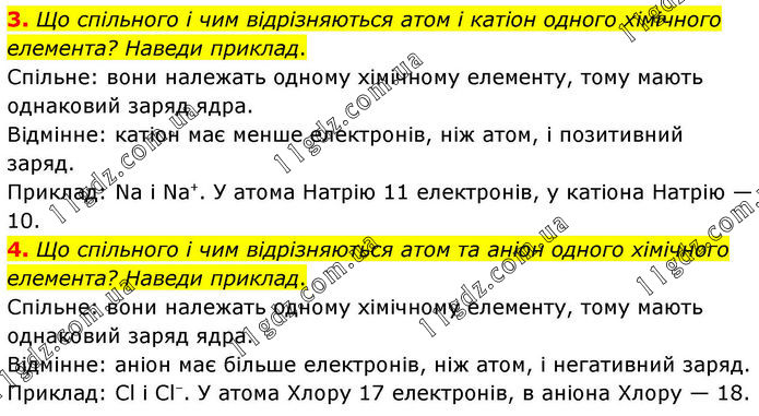 3. Що спільного і чим відрізняються атом і катіон одного хімічного елемента? Наведи приклад. Спільне: вони належать одному хімічному елементу, тому мають однаковий заряд ядра. Відмінне: катіон має менше електронів, ніж атом, і позитивний заряд. Приклад: Na і Na⁺. У атома Натрію 11 електронів, у катіона Натрію — 10. 4. Що спільного і чим відрізняються атом та аніон одного хімічного елемента? Наведи приклад. Спільне: вони належать одному хімічному елементу, тому мають однаковий заряд ядра. Відмінне: аніон має більше електронів, ніж атом, і негативний заряд. Приклад: Cl і Cl⁻. У атома Хлору 17 електронів, в аніона Хлору — 18.