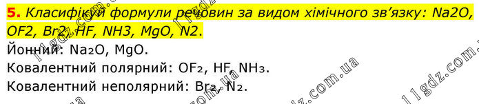 5. Класифікуй формули речовин за видом хімічного зв’язку: Na2O, OF2, Br2, HF, NH3, MgO, N2. Йонний: Na₂O, MgO. Ковалентний полярний: OF₂, HF, NH₃. Ковалентний неполярний: Br₂, N₂.