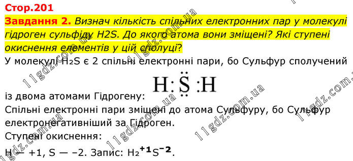 Завдання 2. Визнач кількість спільних електронних пар у молекулі гідроген сульфіду Н2S. До якого атома вони зміщені? Які ступені окиснення елементів у цій сполуці? У молекулі H₂S є 2 спільні електронні пари, бо Сульфур сполучений із двома атомами Гідрогену: Спільні електронні пари зміщені до атома Сульфуру, бо Сульфур електронегативніший за Гідроген. Ступені окиснення: H — +1, S — –2. Запис: H₂⁺¹S⁻².