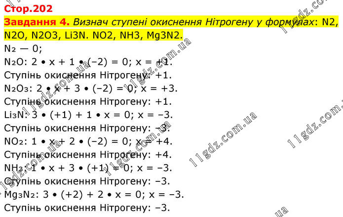 Завдання 4. Визнач ступені окиснення Нітрогену у формулах: N2, N2O, N2O3, Li3N. NO2, NH3, Mg3N2. N₂ — 0; N₂O: 2 • х + 1 • (–2) = 0; х = +1. Ступінь окиснення Нітрогену: +1. N₂O₃: 2 • х + 3 • (–2) = 0; х = +3. Ступінь окиснення Нітрогену: +1. Li₃N: 3 • (+1) + 1 • х = 0; х = –3. Ступінь окиснення Нітрогену: –3. NO₂: 1 • х + 2 • (–2) = 0; х = +4. Ступінь окиснення Нітрогену: +4. NH₃: 1 • х + 3 • (+1) = 0; х = –3. Ступінь окиснення Нітрогену: –3. Mg₃N₂: 3 • (+2) + 2 • х = 0; х = –3. Ступінь окиснення Нітрогену: –3.