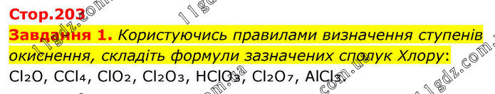 Завдання 1. Користуючись правилами визначення ступенів окиснення, складіть формули зазначених сполук Хлору: Cl₂O, CCl₄, ClO₂, Cl₂O₃, HClO₃, Cl₂O₇, AlCl₃.