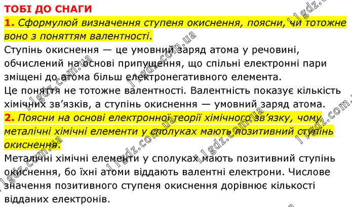 ТОБІ ДО СНАГИ 1. Сформулюй визначення ступеня окиснення, поясни, чи тотожне воно з поняттям валентності. Ступінь окиснення — це умовний заряд атома у речовині, обчислений на основі припущення, що спільні електронні пари зміщені до атома більш електронегативного елемента. Це поняття не тотожне валентності. Валентність показує кількість хімічних зв’язків, а ступінь окиснення — умовний заряд атома. 2. Поясни на основі електронної теорії хімічного зв’язку, чому металічні хімічні елементи у сполуках мають позитивний ступінь окиснення. Металічні хімічні елементи у сполуках мають позитивний ступінь окиснення, бо їхні атоми віддають валентні електрони. Числове значення позитивного ступеня окиснення дорівнює кількості відданих електронів.