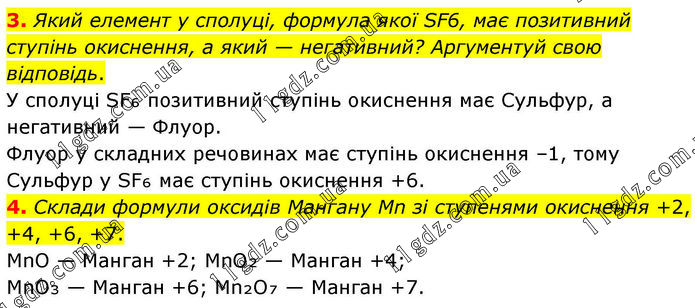 3. Який елемент у сполуці, формула якої SF6, має позитивний ступінь окиснення, а який — негативний? Аргументуй свою відповідь. У сполуці SF₆ позитивний ступінь окиснення має Сульфур, а негативний — Флуор. Флуор у складних речовинах має ступінь окиснення –1, тому Сульфур у SF₆ має ступінь окиснення +6. 4. Склади формули оксидів Мангану Mn зі ступенями окиснення +2, +4, +6, +7. MnO — Манган +2; MnO₂ — Манган +4; MnO₃ — Манган +6; Mn₂O₇ — Манган +7.