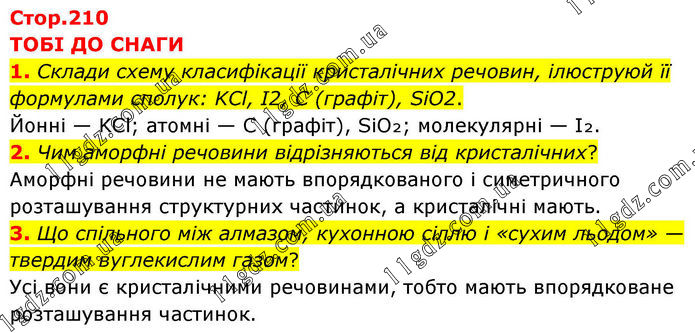 ТОБІ ДО СНАГИ 1. Склади схему класифікації кристалічних речовин, ілюструюй її формулами сполук: KCl, І2, С (графіт), SiO2. Йонні — KCl; атомні — C (графіт), SiO₂; молекулярні — I₂. 2. Чим аморфні речовини відрізняються від кристалічних? Аморфні речовини не мають впорядкованого і симетричного розташування структурних частинок, а кристалічні мають. 3. Що спільного між алмазом, кухонною сіллю і «сухим льодом» — твердим вуглекислим газом? Усі вони є кристалічними речовинами, тобто мають впорядковане розташування частинок.