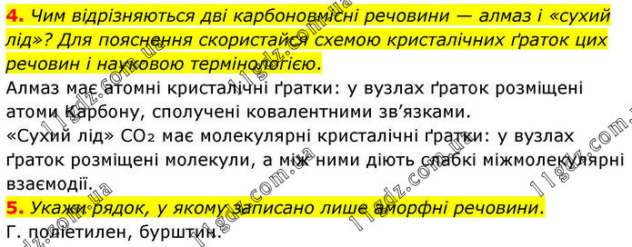 4. Чим відрізняються дві карбоновмісні речовини — алмаз і «сухий лід»? Для пояснення скористайся схемою кристалічних ґраток цих речовин і науковою термінологією. Алмаз має атомні кристалічні ґратки: у вузлах ґраток розміщені атоми Карбону, сполучені ковалентними зв’язками. «Сухий лід» CO₂ має молекулярні кристалічні ґратки: у вузлах ґраток розміщені молекули, а між ними діють слабкі міжмолекулярні взаємодії. 5. Укажи рядок, у якому записано лише аморфні речовини. Г. поліетилен, бурштин.
