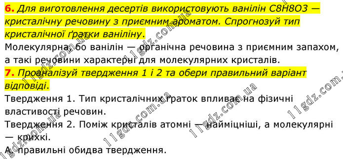 6. Для виготовлення десертів використовують ванілін С8Н8О3 — кристалічну речовину з приємним ароматом. Спрогнозуй тип кристалічної ґратки ваніліну. Молекулярна, бо ванілін — органічна речовина з приємним запахом, а такі речовини характерні для молекулярних кристалів. 7. Проаналізуй твердження 1 і 2 та обери правильний варіант відповіді. Твердження 1. Тип кристалічних ґраток впливає на фізичні властивості речовин. Твердження 2. Поміж кристалів атомні — найміцніші, а молекулярні — крихкі. А. правильні обидва твердження.