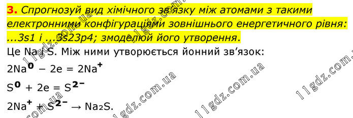 3. Спрогнозуй вид хімічного зв’язку між атомами з такими електронними конфігураціями зовнішнього енергетичного рівня: ...3s1 і ...3s23p4; змоделюй його утворення. Це Na і S. Між ними утворюється йонний зв’язок: 2Na⁰ − 2e = 2Na⁺; S⁰ + 2e = S²⁻; 2Na⁺ + S²⁻ → Na₂S.