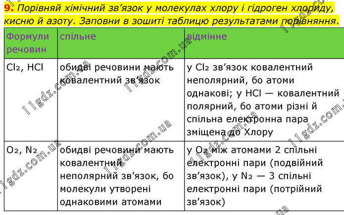 9. Порівняй хімічний зв’язок у молекулах хлору і гідроген хлориду, кисню й азоту. Заповни в зошиті таблицю результатами порівняння.
