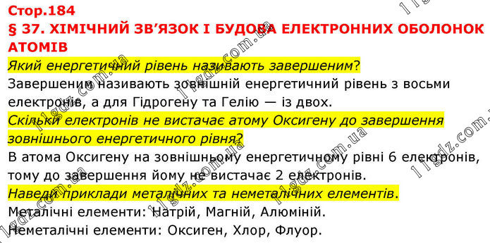 § 37. ХІМІЧНИЙ ЗВ’ЯЗОК І БУДОВА ЕЛЕКТРОННИХ ОБОЛОНОК АТОМІВ Який енергетичний рівень називають завершеним? Завершеним називають зовнішній енергетичний рівень з восьми електронів, а для Гідрогену та Гелію — із двох. Скільки електронів не вистачає атому Оксигену до завершення зовнішнього енергетичного рівня? В атома Оксигену на зовнішньому енергетичному рівні 6 електронів, тому до завершення йому не вистачає 2 електронів. Наведи приклади металічних та неметалічних елементів. Металічні елементи: Натрій, Магній, Алюміній. Неметалічні елементи: Оксиген, Хлор, Флуор.